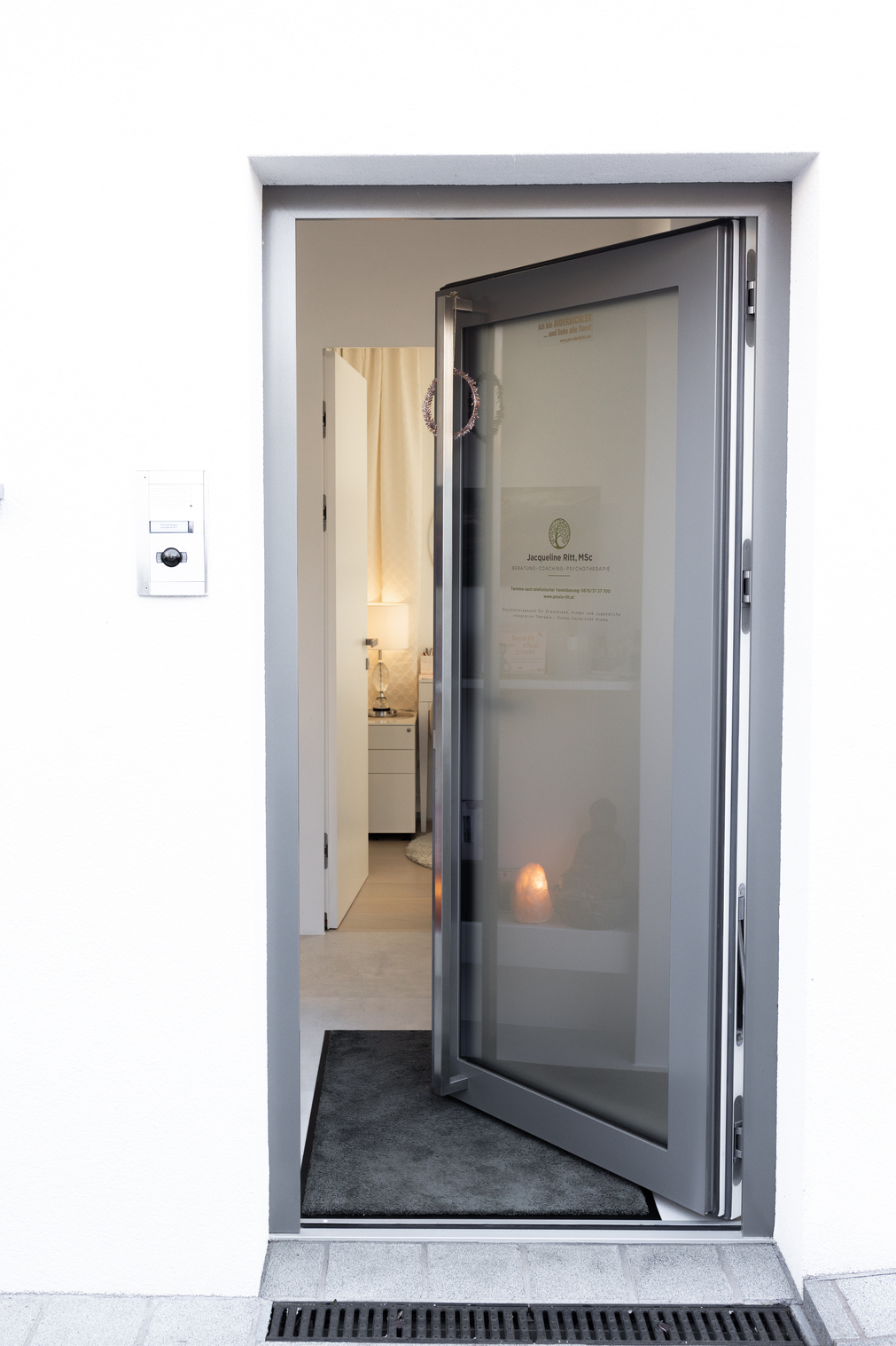 Die Türe ist offen, bitte drücken Sie und nehmen im Wartebereich Platz. Ich werde Sie zum vereinbarten Zeitpunkt abholen.
